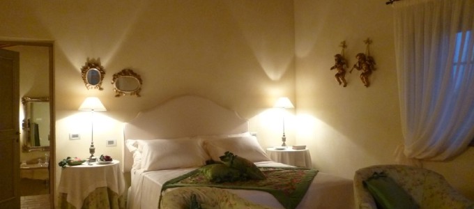 Delicate pink colour charaterizes this suite along with antique furniture making it romantic and intimate. It overlooks the valley and the hills of Ciliano. The bathroom offers guests a shower box in crystal glass, a jacuzzi and chromotherapy.